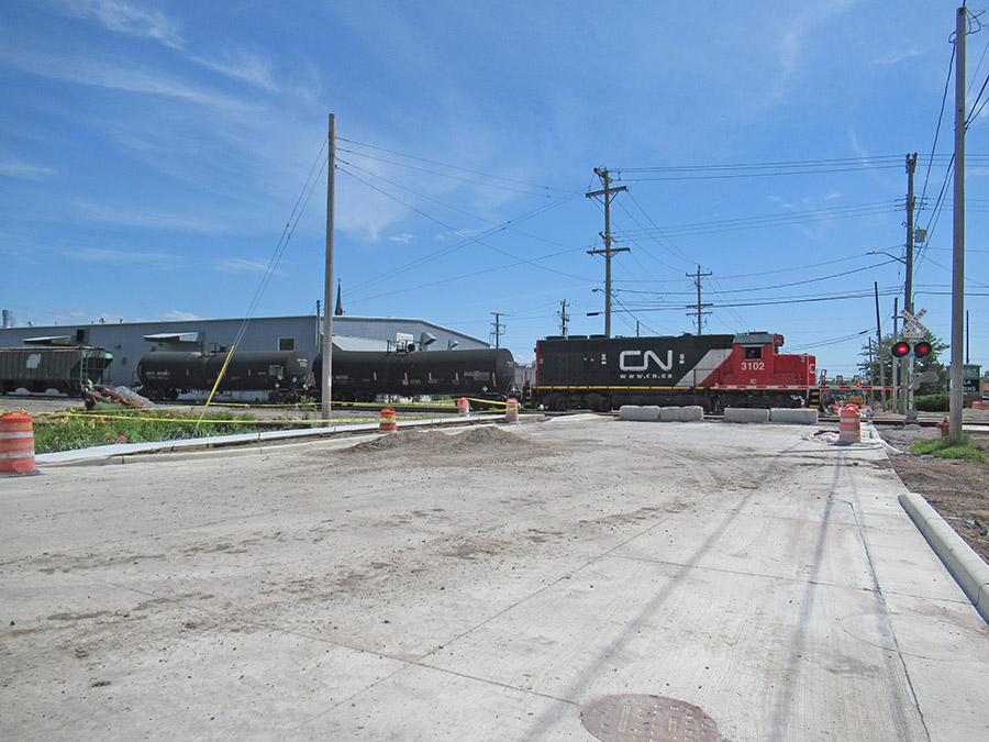 A CN train, led by IC 3102, crosses Racine St. as it works in the former WC yard at Menasha, Wis., on 18 July 2025. These are former WC rails, but they connect the Menasha Branch to the Neenah and Appleton Branches after a portion of the original M&N rails were removed after the SOO purchased the MILW in 1985. The M&N rails ran along the other side of the building on the left and the depot stood at Racine St. Photograph by Tom Bruss.