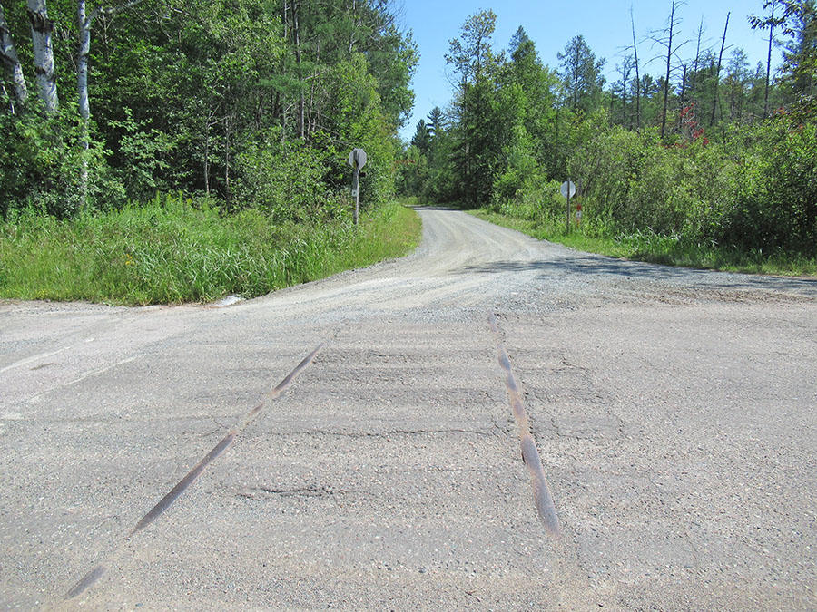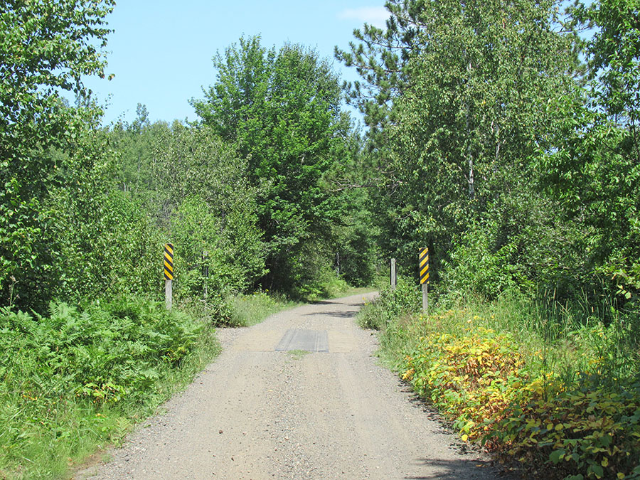 Looking southwest along the former M&N right-of-way at Co. Rd. LF at Town of Republic, Marquette Co., Mich., on 25 July 2024. This is where the actual rails end and the rail trail proper begins. The remnants of a spur cross the road and enter the gate for the mine property to the left. The trail from Republic is just out-of-frame to the right. Photograph by Tom Bruss.