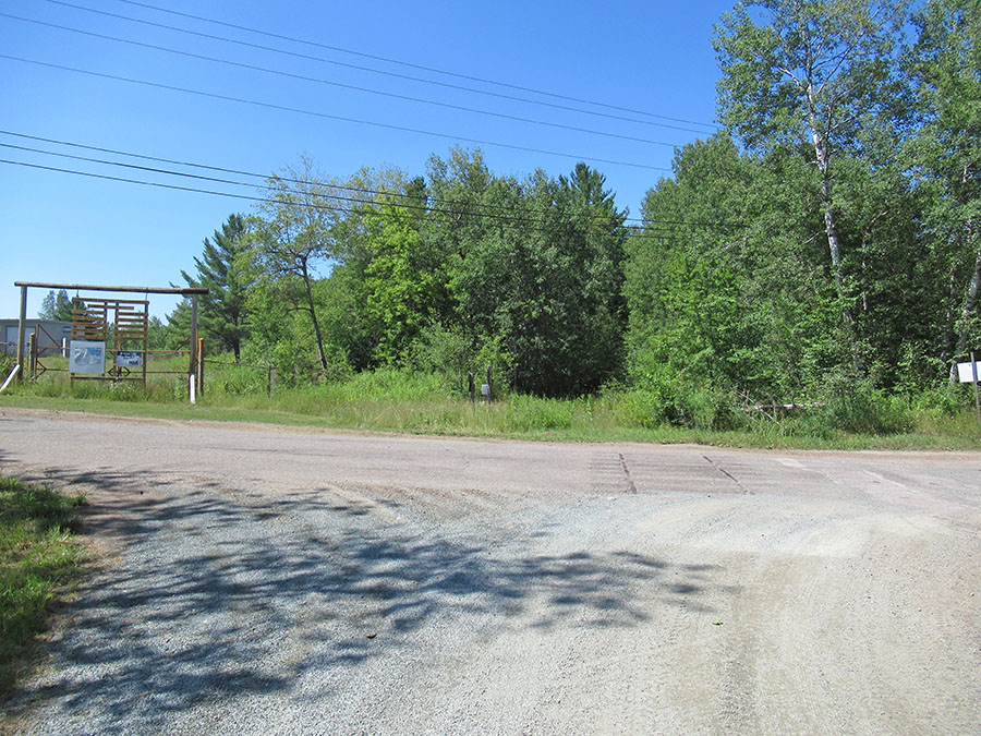 Looking west along Khoury Rd. toward the former M&N rails at Floodwood, Mich., on 26 July 2424. The cars are stored on the main line, but there still is a passing siding here. Photograph by Tom Bruss.