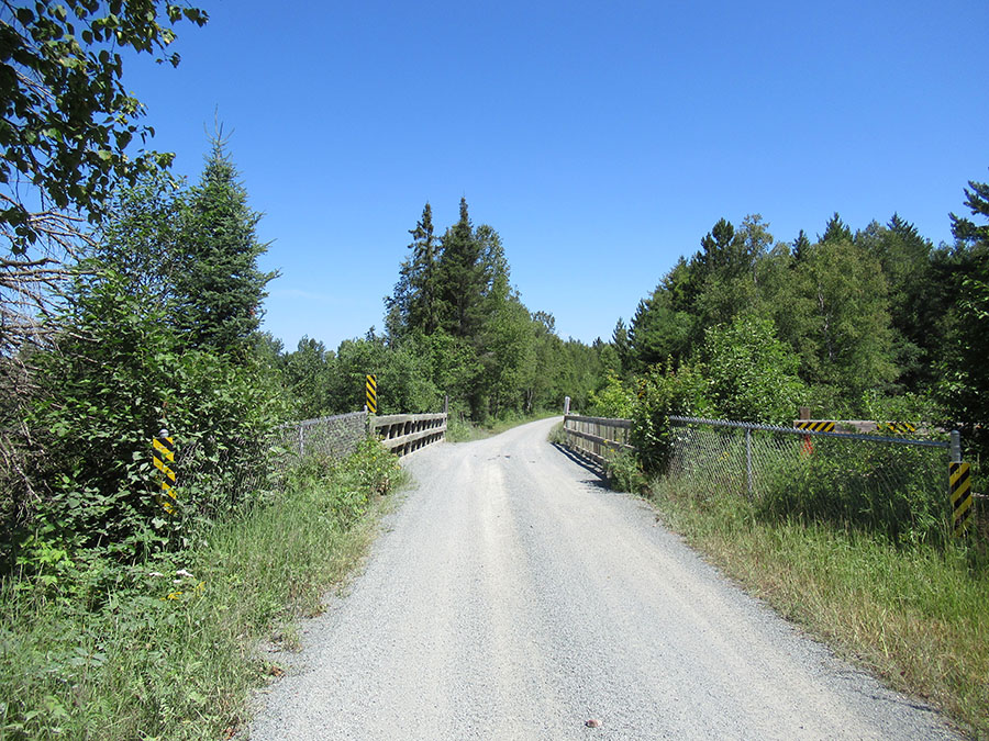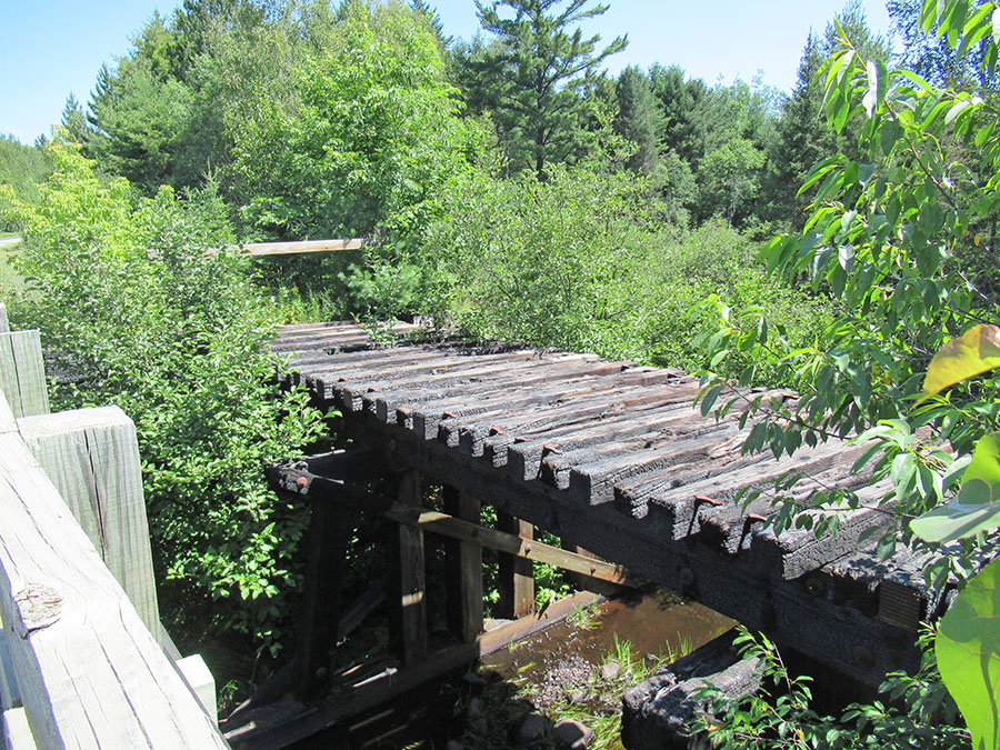 Looking northwest along the former M&N right-of-way, now the Republic/Champion Grade Trail, at Town of Humboldt, Marquette Co., Mich., on 25 July 2024. This is a bridge over a tributary of the Black River. Photograph by Tom Bruss.