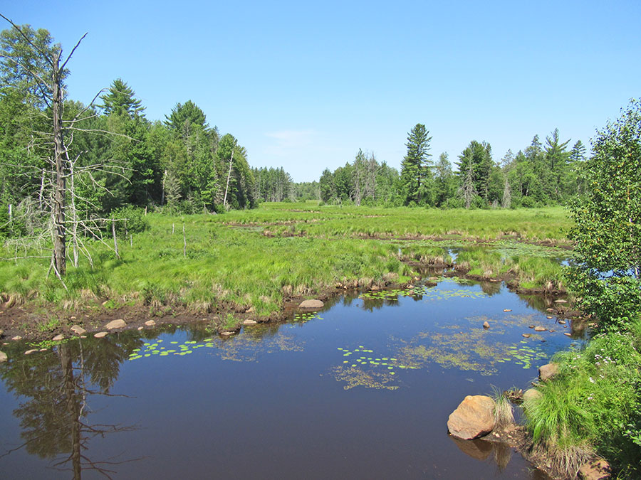 Looking southeast from the former M&N right-of-way, now the Republic/Champion Grade Trail, at Town of Humboldt, Marquette Co., Mich., on 25 July 2024. This is a wide spot in a tributary of the Black River. Photograph by Tom Bruss.
