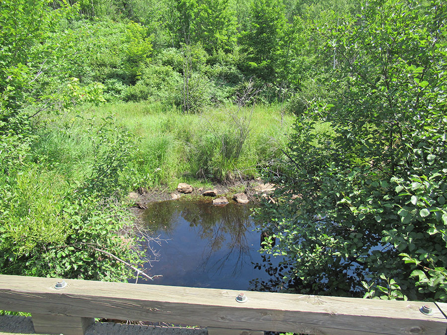 Looking southwest from the former M&N right-of-way, now the Republic/Champion Grade Trail, at Town of Humboldt, Marquette Co., Mich., on 25 July 2024. This is a bridge over a tributary of the Black River. Photograph by Tom Bruss.