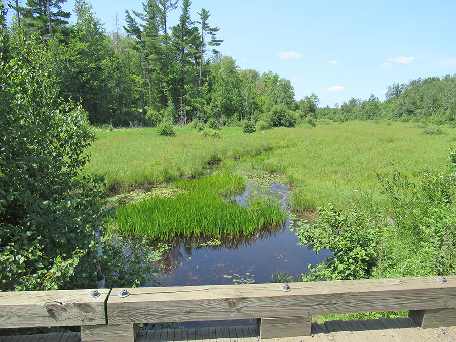 Looking west from the former M&N right-of-way, now the Republic/Champion Grade Trail, at Town of Humboldt, Marquette Co., Mich., on 25 July 2024. This is a bridge over a tributary of the Black River. Photograph by Tom Bruss.